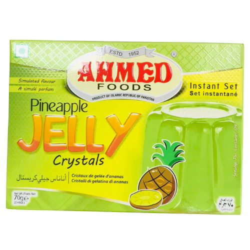 Ahmed Pineapple Jelly 70g (crystals) offers a quick, sweet, and tangy tropical dessert mix, providing instant-set jelly with a vibrant pineapple flavor, made with carrageenan for texture and suitable for vegetarians, yielding 4 servings from the convenient packet. It’s an easy-to-prepare, halal-certified product from Pakistan, perfect for adding fruity fun to any occasion.