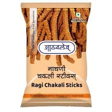Athavale Ragi Chakli Sticks are a crispy, savory Indian snack made primarily from nutritious ragi (finger millet) flour, along with other flours and a blend of spices. They are characterized by their crunchy texture, spicy and authentic taste, and are often enjoyed as a tea-time snack or a quick bite. The sticks are made from a dough of ingredients like ragi, wheat, rice, and gram flour, seasoned with spices such as chili powder, garam masala, and salt.
