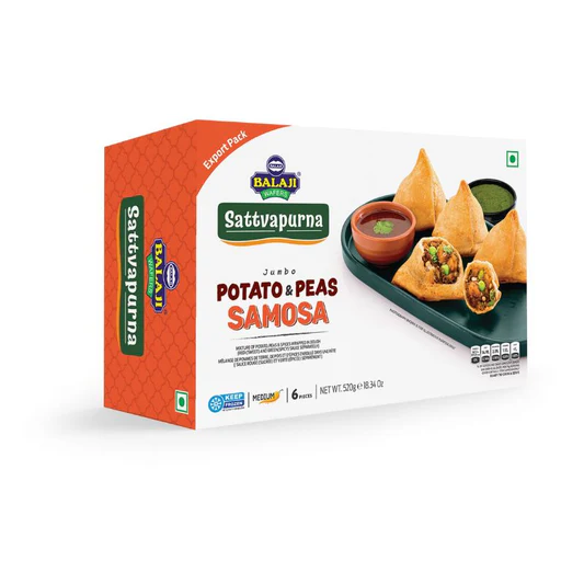 Balaji Jumbo Samosa is a hearty Indian snack featuring large, crispy pastries stuffed with a flavorful blend of spiced potatoes and green peas. Infused with traditional spices like cumin, coriander, and green chili, these samosas deliver a perfect balance of savory and spicy notes with a golden, flaky crust. Ideal for tea-time, festive gatherings, or a satisfying snack, they capture the essence of authentic Indian street food. Ready-to-cook, these jumbo samosas offer a delicious, restaurant-style experience at home.