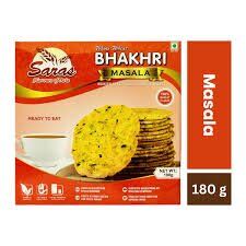 Saras Bhakhri Masala is a 180g pack of ready-to-eat, roasted, whole wheat crisps infused with an aromatic blend of authentic Indian spices. These vegetarian snacks are vacuum-sealed for freshness and are described as a crunchy, savory, and convenient option perfect for snacking on its own or with dips and chutneys.