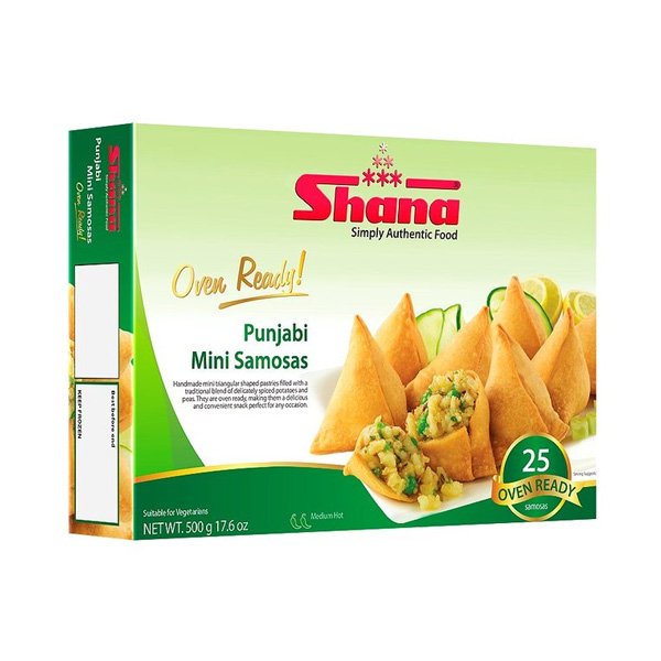 Shana pyramid shaped short crust pastries filled with a delicious and authentic blend of spicy potatoes and peas. At Shana Foods we believe in quality and are passionate about it. Only the finest and purest ingredients go into the making of Shana products and we do not use colourings, flavourings or preservatives. Suitable for vegetarians.
