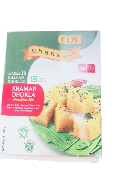 Shankar Khaman Dhokla” likely refers to a popular brand or a specific style of soft, spongy Gujarati steamed snack made from gram flour (besan), known for its light texture and tangy-sweet flavor from a tempered tadka of mustard seeds, curry leaves, chilies, and sugar-water, often garnished with coriander and coconut, with ready-mixes available under names like Gauri Shankar Khatri & Sons or MTR for easy preparation at home, though “Khaman” and “Dhokla” are often used interchangeably for this version.