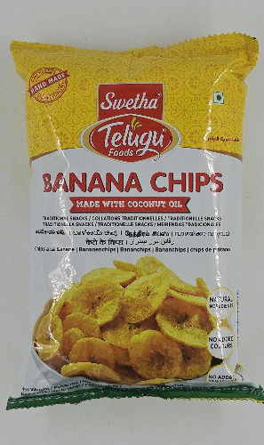 Crispy and delicious Swetha Telugu Foods Banana Chips, made with pure coconut oil for an authentic taste. Perfectly fried, naturally seasoned, and free from added colors — a healthy and tasty snack for all occasions!