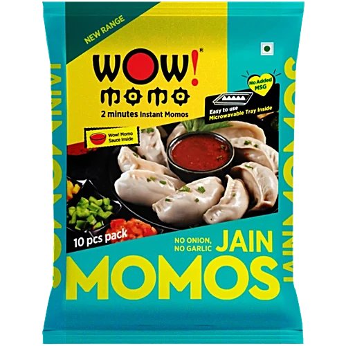 Wow! Jain Momos (240gm pack) are a vegetarian, frozen snack that are specifically formulated without onion and garlic to adhere to the Jain diet. The product is designed for convenience, typically ready in minutes via steaming or microwaving, and aims to deliver a restaurant-style taste at home.